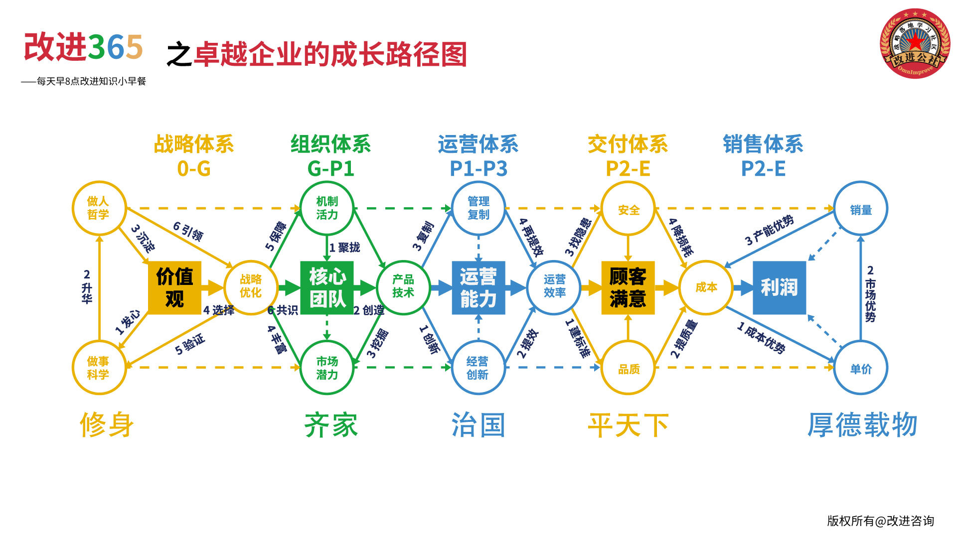 作者/丁晖/《管理的逻辑》作者 2020年10月17日 本文为作者原创,版权归作者所有,不得擅自转载、复制、引用。如需使用,需与作者取得联系,征得授权。一旦发现侵权问题,将有权追究侵权责任。 ![]() 从战略落地到绩效改进,一个重要的基础原则就是“系统思考”,而这张图正是最能够体现系统思考的底层工具,经营管理中常犯的错误为头痛医头脚痛医脚,这个工具可以给帮助我们建立起相对完整的思维,协助于企业领导人和管理者逐步从“狠抓执行”的状态逐步过度到“预先设计”的角色,不谋全局这不足以谋一域,不谋万世者不足以谋一时,当我们拥有了大局观,才能构建短期与长期、手段与目的、前因与后果、投入与产出等多种关系,胸有成竹,处变不惊。 以“运营能力”为中心轴,可以把这张图分为左一半和右一半两部分,多数管理团队经常围绕右一半讨论的多,即短期的、紧急的工作,但右一半的结果又通常由左一半内容所决定,即长期的、重要的规划,一个组织如果不考虑左一半,就会失去长期主义,从而产生阶段性的战略迷茫,但如果不考虑右一半,就容易掉进“理想主义”的陷阱,经常坐而论道却忘记了短期生计的来源,左右双方的平衡才是一家成功企业的应有选择。 从左到右我们能够看到中间有一条清晰的因果线,即利润是如何产生的?如果直接说价值观决定了利润似乎有些唯心主义,但持续正确的价值观决定了战略正确选择,沉淀了核心团队和技术,提升了运营能力和效率,保障了客户满意造成成本的降低,最终表现在利润的增长上,似乎大家就可以接受这个关系了。 围绕这条中线,我们设计了上下两条辅助因果线,上面是以“做人哲学”来驱动的几个方面,包括机制、管理、安全和销量,收与放、松和紧、得与失、大和小都是相对的,管理者对这些方面的认知直接决定了态度,这才有了企业的文化本质上是管理者文化的说法,所以领导人需要相信“善良”和“利他”的力量。另一方面,下面的一条线是以“做事科学”来驱动的几点,包括市场、经营、品质和定价,这些探索型的工作需要在前人的经验、理论、方法和工具的基础上持续改进,才能取得良好的效益。领导人如果不具备科学的精神,就容易带着一群人苦干甚至蛮干,从“不知道自己不知道”到“不知道自己知道”,就是团队持续学习、不断修炼、形成智慧的过程,总之,一个对科学具有敬畏之心的团队,自然能够走的更加长久的。 我们把左一半的内容总结为“战略解码”,把右一半的内容总结为“绩效改进”,贯穿左右两部分的是“组织设计”,这三者构成了企业战略落地的全景图。企业也是有机体,但我们的传统商学教育却习惯于釆用“肢解主义”,即用不同专业的角度来看待组织,正如一群**的NBA球员不一定能赢球一样,一群专业能力最强的管理者不一定能给企业带来利润。因此,我们把这种“组织有机体”的设计称之为“顶层设计的基因,长期坚持后,这种基因会转化成强大的核心能力,从而可以极大的发挥组织内外部的专业价值。 既然企业是有机体,就必然有其成长的基本规律,在未来的时间了,我们会尝试给大家来通过“改进365”的频道,每天解读一点内容,在不确定的环境下,活着是最重要的,我们需要以长跑作为基本姿态,修正好基本的思路和方向,每天进步一点点,未来自然更加美好。 让我们相互鼓励,从“修身”出发,力求到达“厚德载物”的精神与物质的彼岸。 ![]() 扫码加入钉钉社群 ![]() 获取更多精彩文章 ▼ ![]() |