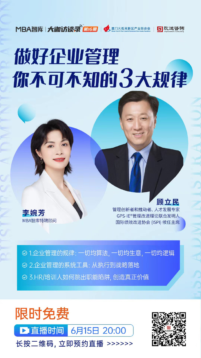 2022年6月15日顾立民老师受邀MBA智库《大咖访谈录》,顾老师分享的主题是《做好企业管理·你不可不知的三大规律》顾老师主要分享了三大方面的内容:1、企业管理的规律:一切均算法,一切均生意,一切均逻辑(管理不是艺术,管理是有“标准”答案的);2、企业管理的系统工具:从战略到每个员工;3、HR/培训人如何跳出职能陷阱上升到系统思维,创造万众期待的价值。本次直播在线人数高达8千多人,想看具体内容可识别上方二维码,看视频回放哦。
