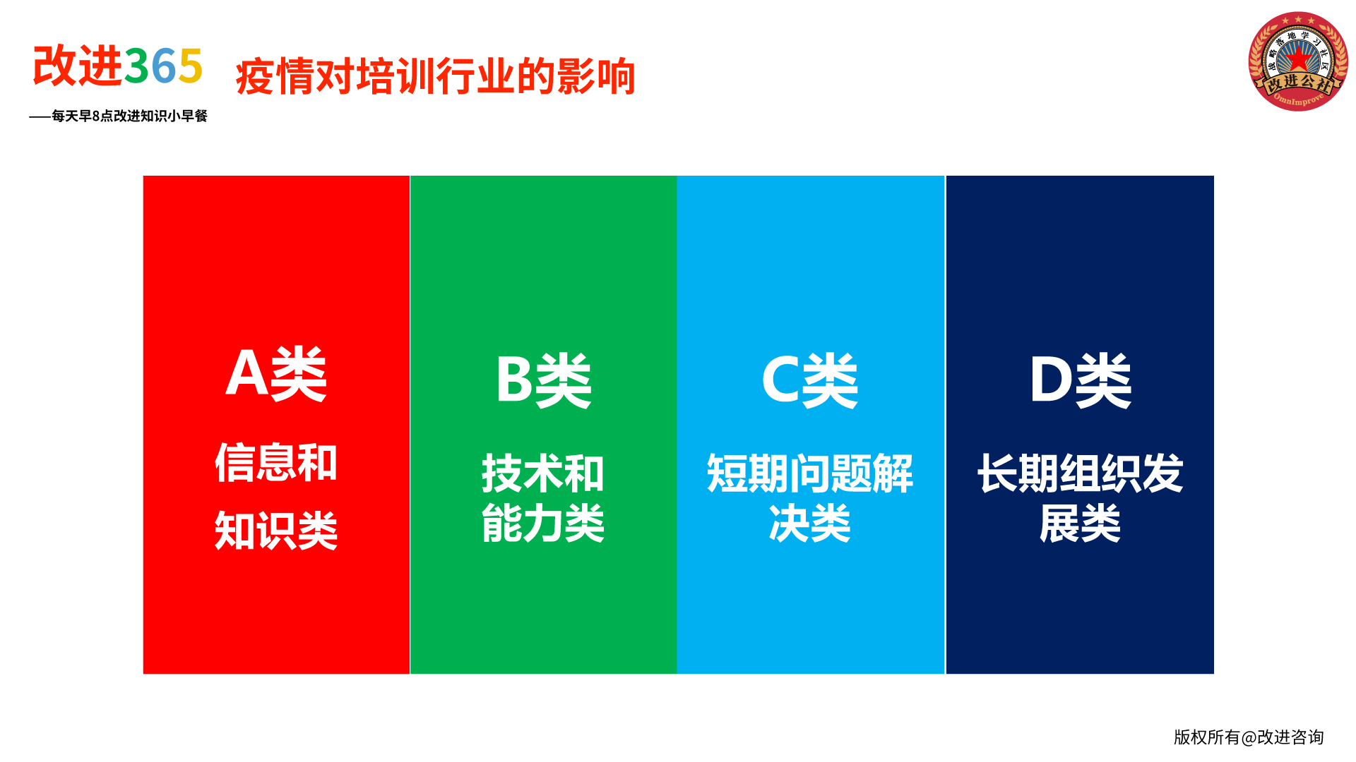 ![]() 作者/丁晖/《管理的逻辑》作者 2020年12月2日 本文为作者原创,版权归作者所有,不得擅自转载、复制、引用。如需使用,需与作者取得联系,征得授权。一旦发现侵权问题,将有权追究侵权责任。 前言 接近年关,武汉宣布封城,多部春节档电影宣布延迟到撤档,大量的旅游团退团,酒店的年夜饭退单,春节联欢晚会也史无前例的临时增加了为武汉加油的节目,媒体在宣布居家为国做贡献,很多人调整的春节的行程,酒精脱销,口罩脱销,正在发生的一切都在表明,这注定是一个不平凡的春节。 作为经历了2003年非典的培训人,我自然会思考这突如其来的疫情会对培训行业产生哪些影响,培训行业是附属在组织成长上的服务行业,任何一次经济的波动都会影响企业的稳定,而企业的稳定又会影响到培训的发展,根据多年的从业实践和思考,我将从短期、中长期和个人影响等三个方面来描述本次疫情会对培训行业带来的影响。 ![]() 和2003年的非典相似,本次疫情将会对整体的经济产生影响,具体表现为对社会服务类行业影响较大,包括酒店、餐饮、娱乐、旅游、交通等,当年Q2的数据比上年下滑近50%,疫情解除之后,积蓄的需求迅速反弹,到2004年,这些行业开始大幅度的发展。因此,受宏观经济的影响,多数企业会面临上半年业务下滑,工作量下降的情形,但到了下半年,可能会遇到业绩提高,但交付压力也空前增长的状况。 在这样的前提下,培训首先遇到的困境是上半年的线下课程难以实施,大量的交付需要依靠线上,但线上的基础设施、内容、过程流程、人员习惯等方面没有做好准备,培训所带来的效果面临挑战;同时,大量企业的业绩下滑,会带来整体预算的调整,培训费用随之将缩水;第三,业务部门的节奏将被打乱,带来了大量临时性的培训需求需要被满足,这也给培训部门带来巨大压力。 疫情同样也会给培训行业带来机遇,从某种角度来说,本次疫情是给很多企业提了一个醒,那些组织能力和人才队伍较强的企业会更加容易面对危机,而在这方面偏弱的企业受到的冲击更大,正如2008年金融危机时流行的一句话:当潮水退去之后,谁在裸泳一目了然。这会阶段性的促进企业家或管理者对组织发展和人才培养方面的思考,企业要成长,不能仅仅关注于厂房、设备、办公用品等硬件,还有关注组织、流程、标准、人才等软件的建设。 当组织发展的需求提升之后,对培训从业者来说也将面临挑战,过去以事务性工作为主,未来要接受专业化的挑战;过去以被动的方式服务业务,未来要面临更多前置化需求的挑战;过去的培训部门只需要做好“资源中心”的工作,未来需要迎接“技术中心”甚至“数据中心”的挑战;过去多数组织知识、技能类培训项目,未来可能要组织问题解决类甚至组织发展类项目。 如果没有这次疫情,很多企业也已经感知到企业战略和组织发展中的偏差,一直以来也期待能够有机会组织内外部的力量来优化组织结构、梳理流程标准、提升岗位能力等,但过去总是找不到合适的机会来实施,现在应该是不错的机会;第二,员工可以通过线上的培训来提升能力,线上培训有多种,知识类的课程偏多,也会有某些技能类的训练营,作为管理者应该选择具有系统方法论为底层逻辑的课程,储备能力和工具,为业务的回暖交付打下基础; 短期中很多公司将以在家/在线办公为主要模式,如何提升和保障在家/在线办公的效率呢?主要取决于管理者制定目标、分解目标和推进任务的能力,其实传统的集中办公也同样如此,所谓“执行”,是由“执”和“行”两个方面构成,“执”强调的规划和掌控,“行”强调的是推进和行动,当管理者能够将目标结果到过程形成有逻辑、可量化、能执行的任务包后,员工也能够通过在家/在线的模式有效完成任务,实现交付。 从长期战略的角度来看,这次疫情毕竟是短期的,我们今天遇到的很多困境其实不是由疫情造成的,而是过去的基础不够,而在当下更早的爆发出来而已。因此,企业一方面需要处理短期紧急的事务,更要准备长期的重要的事情,包括战略的重新定位,重新描述客户,重新规划业务组合,重新优化组织机制等,也需要构建组织能力,包括核心产品和技术的打造,经营原则和策略的创新和管理逻辑和实践的复制等。 对于中期来说,我们的建议是“目标不变节奏变”,年前刚刚签订的各项指标在年后复工后暂时先不要调整,因为我们要关注不仅仅是目标的数据本身,更是达成这个目标数据的可能性。一季度的环境发生了变化,会导致我们所遇到的问题会发生变化,我们需要来研究这些问题中可控的原因、创新的策略和落地的行动,当我们重新思考后,就能看到很多的机会,比如我们在春节期间及时行动,组织了多场研讨会、沙龙和直播,发现今年二月份获取新客户的数量居然和往年相比增加了十倍多。 在这样的背景下,学习的场景和学习方式也将会发生变化,我们首先将培训业务分成四类: A类为信息和知识类; B类为技术和能力类; C类为问题解决类; D类为组织发展类。 未来A类的课程将越来越多的被线上知识付费的服务所替代,B类的课程会转化成以“设计标准、规模复制”的项目,这两类需求会越来越多的由企业内部人员主导和交付。但随着企业管理团队更加关注实效和未来,C类和D类需求会逐步增加,C类的需求以行动学习、知识萃取、绩效改进的方式为主要模式,